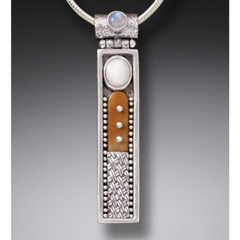 The fossilized ivory in this pendant is made from walrus ivory tusk, a prized material that is between 500 and 3,000 years old. This ivory has lain buried underground for centuries where minerals color it the earthen shades we see today. Erosion and the tides bring the ivory back to light, and Native peoples gather it for carving, sale, or trade. Fossilized walrus ivory tusk is an important part of their cultural heritage and indigenous culture; it is valued across the world as rare historical accent in fine jewelry and art works.