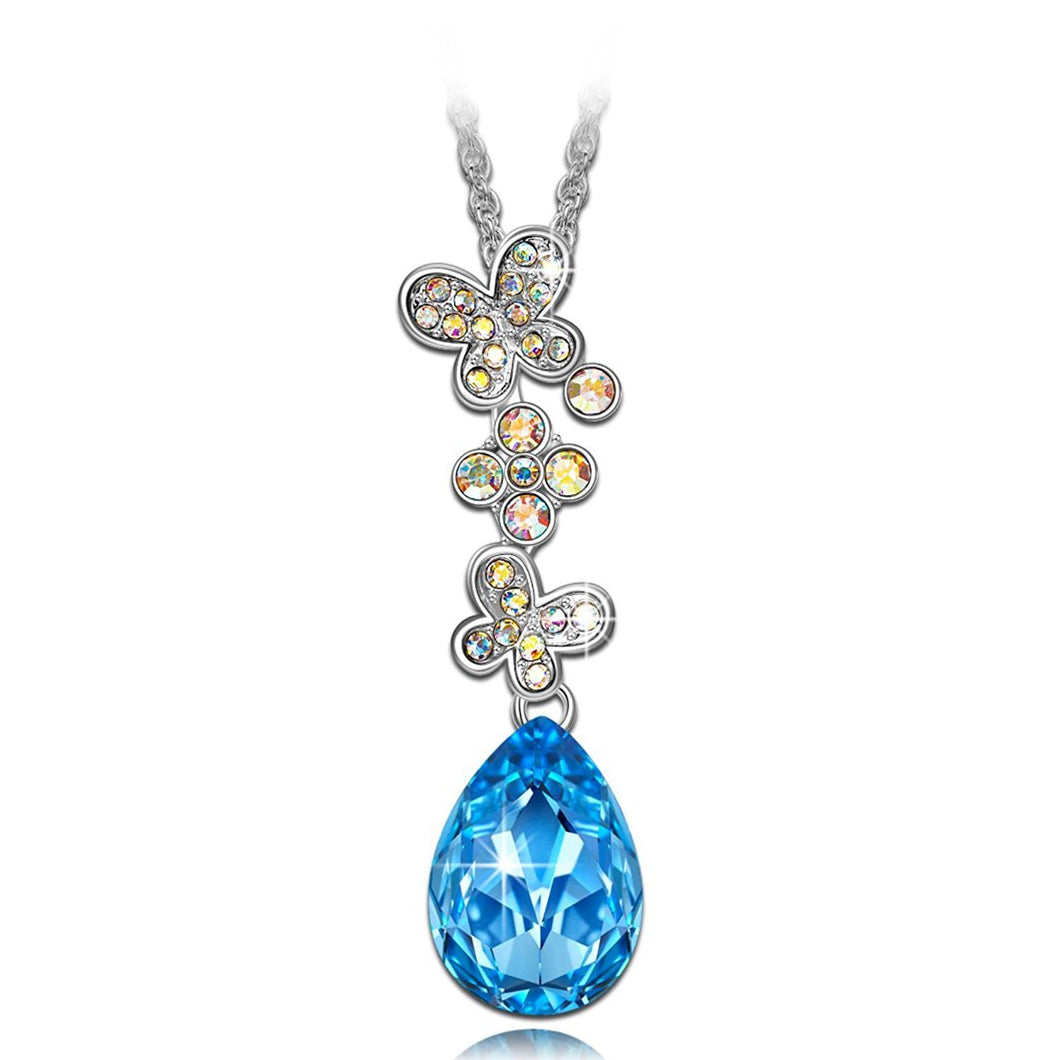 - ♥Romance Design♥ With a butterfly motif crafted in pavé and Aquamarine-colored fancy crystal elements, this necklace is perfect for spring. The water drop-shaped pendant adds a further element of romance to this spectacular design. Between the two butterflies is a lucky clover, it can bring good luck to her!