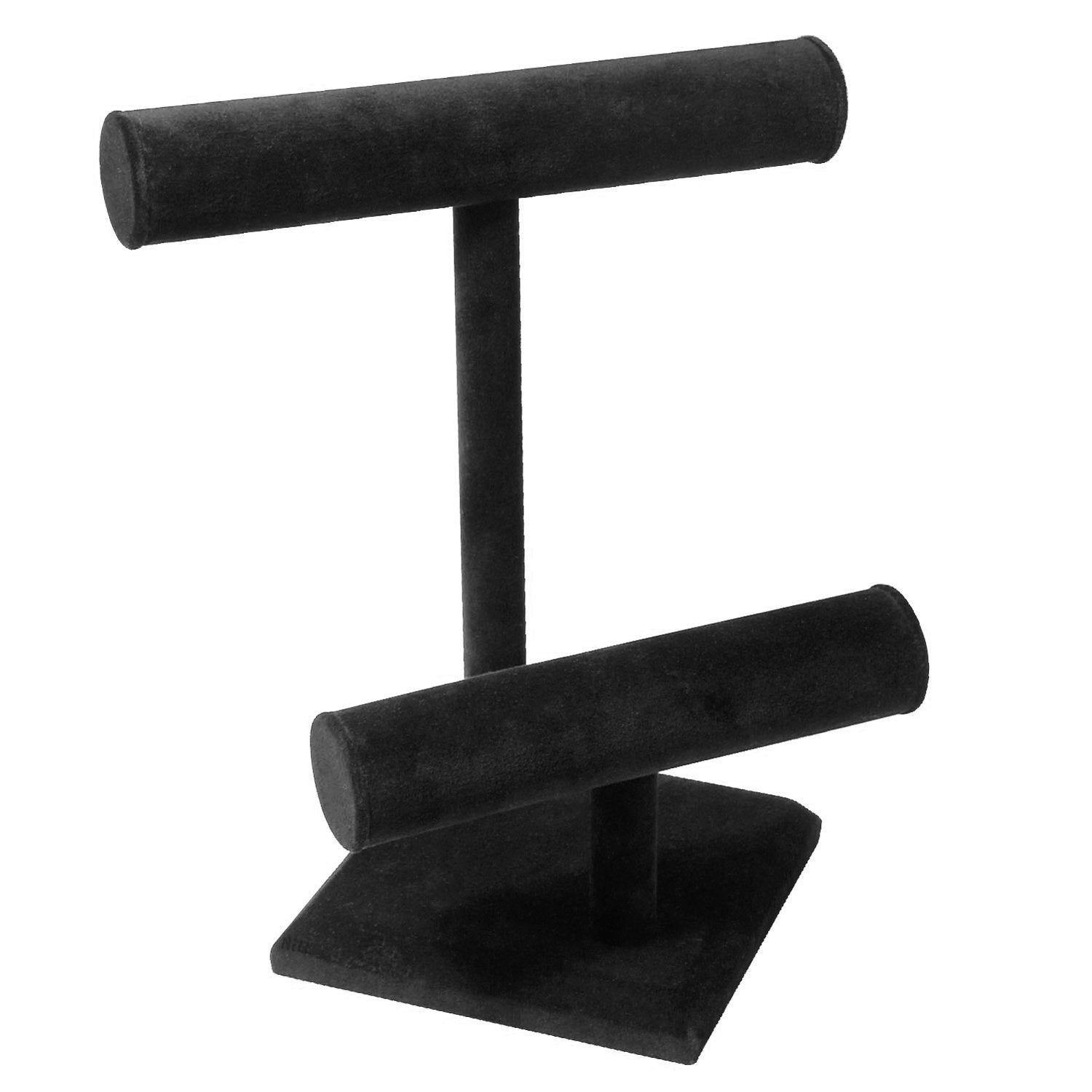 This double T-bar (7 1/2" and 9 3/8" x 1 5/8" diameter) display holds a variety of bracelets and necklaces of different shapes and sizes. The bars stand on 2" and 7 3/4" rods, allowing you to display long necklaces and bracelets. Made of wood covered with soft velvet or leatherette.